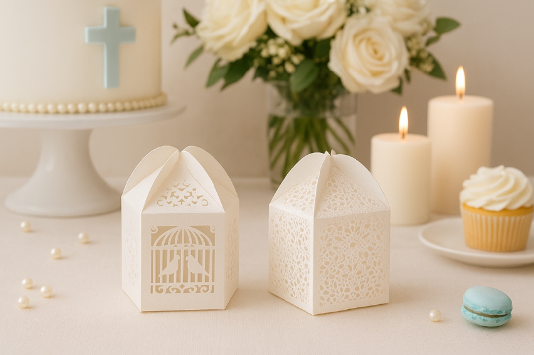 Encante seus convidados com esta delicada caixinha decorativa em papel rendado, ideal para lembrancinhas de batizado, aniversário, casamento ou chá de bebê.